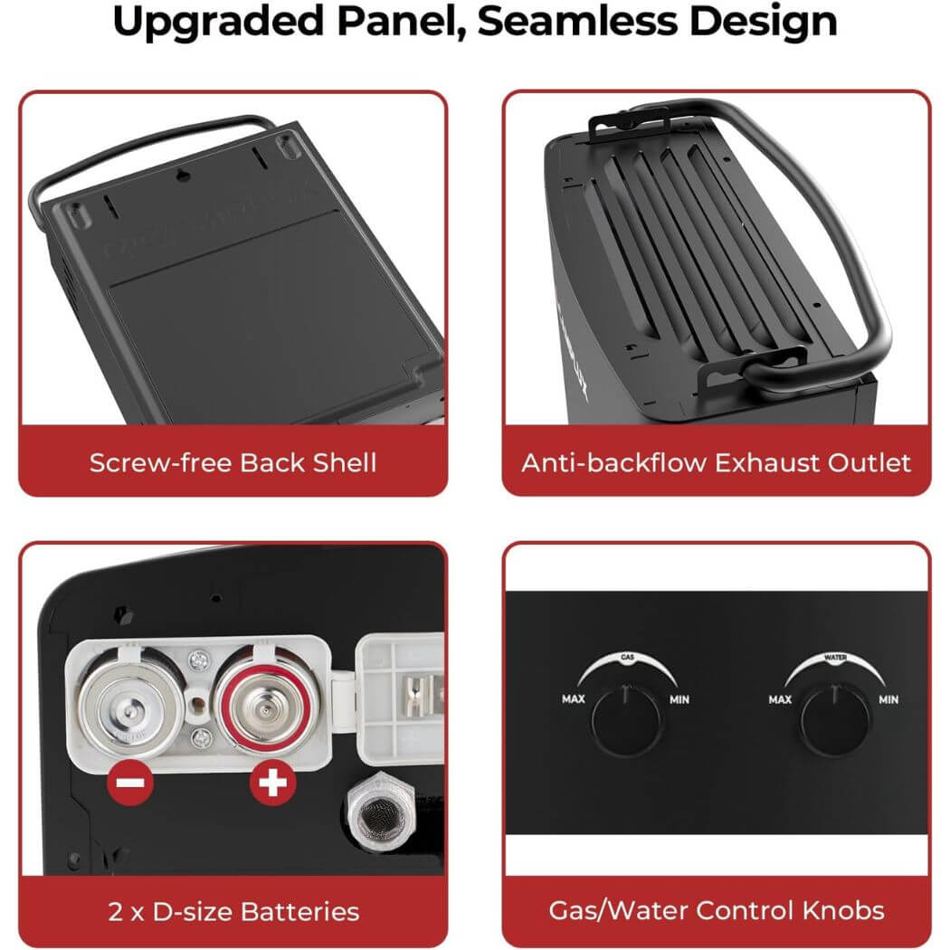 - Energy & Cost Saving: Portable hot water heater with maximum power output 34,000btu/hour, provides 1.32 GPM hot water on demand, no need to preheat,saving up to 50% on water heating costs.