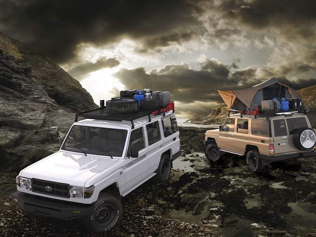 This 2166mm/85.3" long 3/4 size Slimline II cargo carrying roof rack kit for the Toyota Land Cruiser 70 contains Slimline II Tray and Wind Deflector, as well as 6 Gutter Mount legs for mounting the Tray to the vehicle. It installs easily with no drilling required.