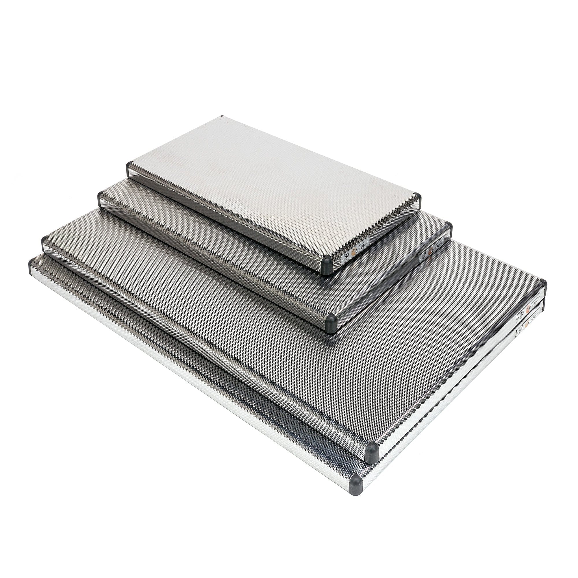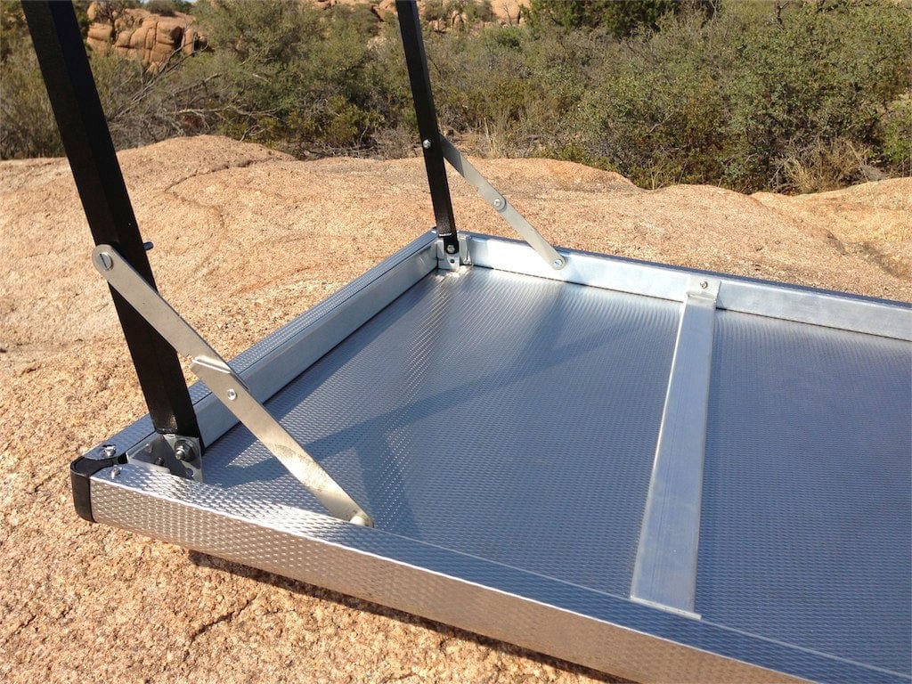 The Eezi-Awn K9 Camp Table, made from stainless steel and aluminum, is a lightweight and compact folding table that stores easily under you Roof Rack with the Table Mounting Kit, saving valuable interior storage capacity. Available in multiple sizes, these tables provide an excellent place to prepare and serve meals, fix your fit, hold the lantern, and generally avoid placing your stuff in the dirt. The surface is made of a dimpled and polished stainless teel surface with complimenting black polycarbonate corners, and is supported by a set of black, powder-coated aluminum folding legs. The dimpled surface not only looks great, but it increases the material rigidity, allowing for a thinner and lighter surface. The aluminum frame and legs are light and corrosion resistant.