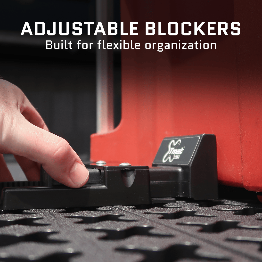 Tmat’s truck bed mat is the ultimate in truck bed organization. Cargo blockers plug into the mat to divide your truck bed into unique compartments around your tools and equipment. By installing Tmat between the wheel wells, the mat can slide across your truck bed and onto your tailgate for easier access to cargo. Tmat can also be customized to install around wheel wells, onto drawer systems, bed slides, or even a sheet of OSB with rollers.